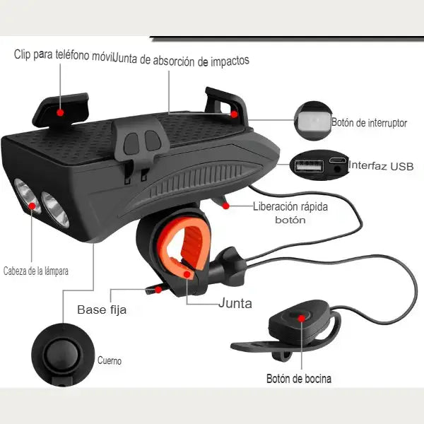 - 🚴 4 en 1: soporte para teléfono, linterna, bocina y banco de energía.
