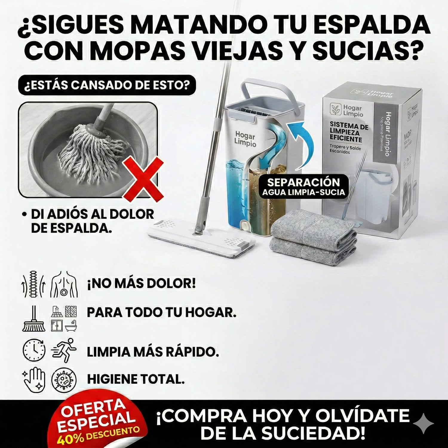 - ⚡ Manos 100% limpias siempre: El balde inteligente hace todo el trabajo sucio por usted. ¡Chao a exprimir mechas con las manos!