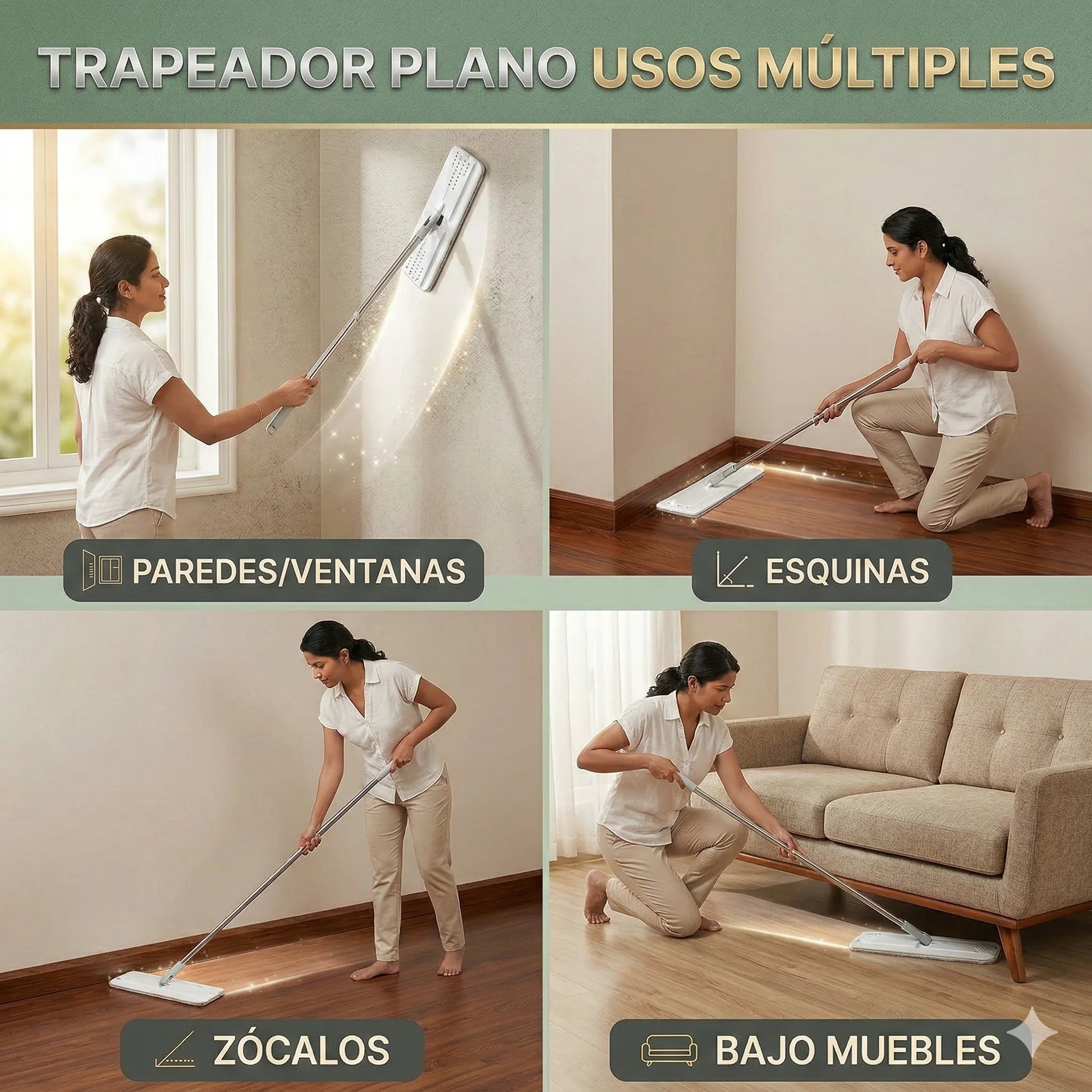 dual (Un lado lava, el otro escurre). - Mopas: Microfibra de alta absorción, lavables en lavadora.
