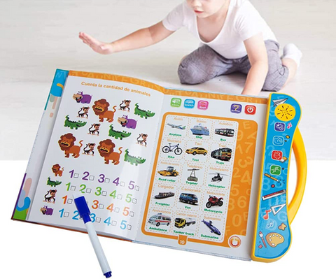 Este libro tiene sonido en español e inglés en las páginas, y además incluye un plumón, ya que las páginas son tipo pizarrón. Cuenta con 10 páginas llenas de distintas actividades y abecedario con sonido en español.